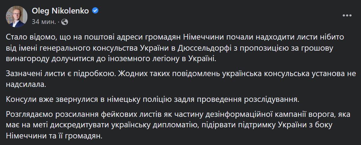 10:25 Немцам по почте стали поступать фейковые письма якобы от имени генерального консульства Украины в Дюссельдорфе с предложением за денежное вознаграждение присоединиться к иностранному легиону в Украине, сообщили в украинском МИД.
