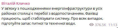 В Киеве после атаки РФ перебои со светом, водой, теплом - Кличко