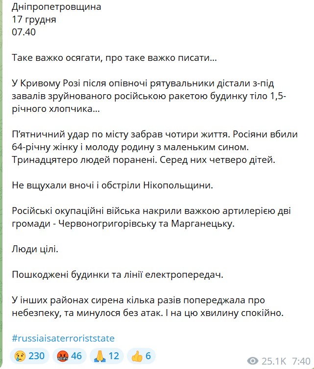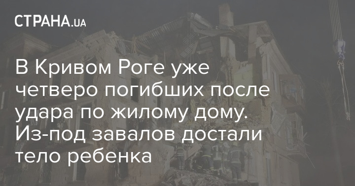 В Кривом Роге при падении ракеты на жилой дом погибло четыре человека - 64-летняя женщина и молодая семья с полуторагодовалым сыном.