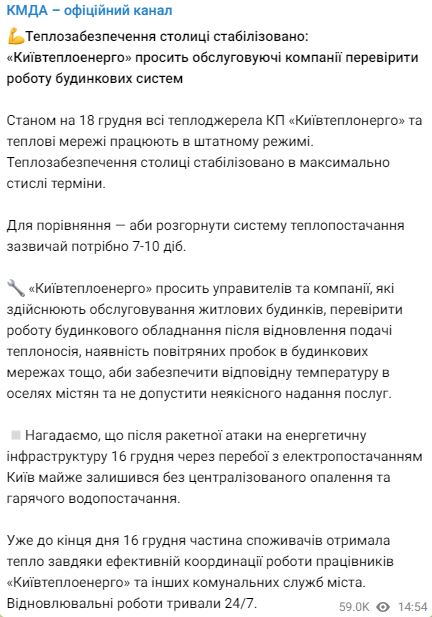 Напомним, что после ракетной атаки на энергетическую инфраструктуру 16 декабря из-за перебоев с электроснабжением Киев почти остался без централизованного отопления и горячего водоснабжения.