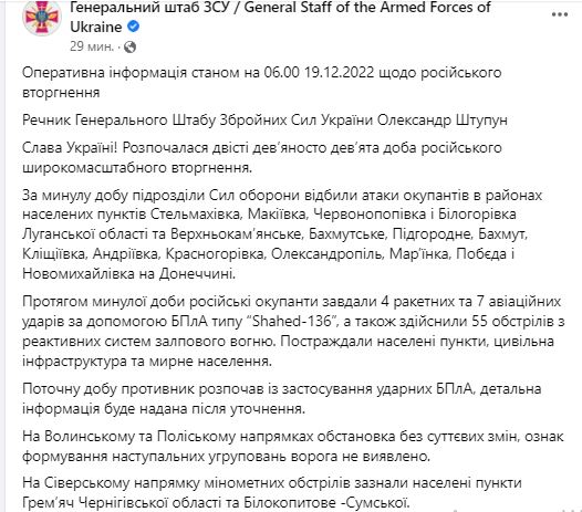 Генштаб Вооруженных сил Украины обнародовал сводку на утро 19 декабря.