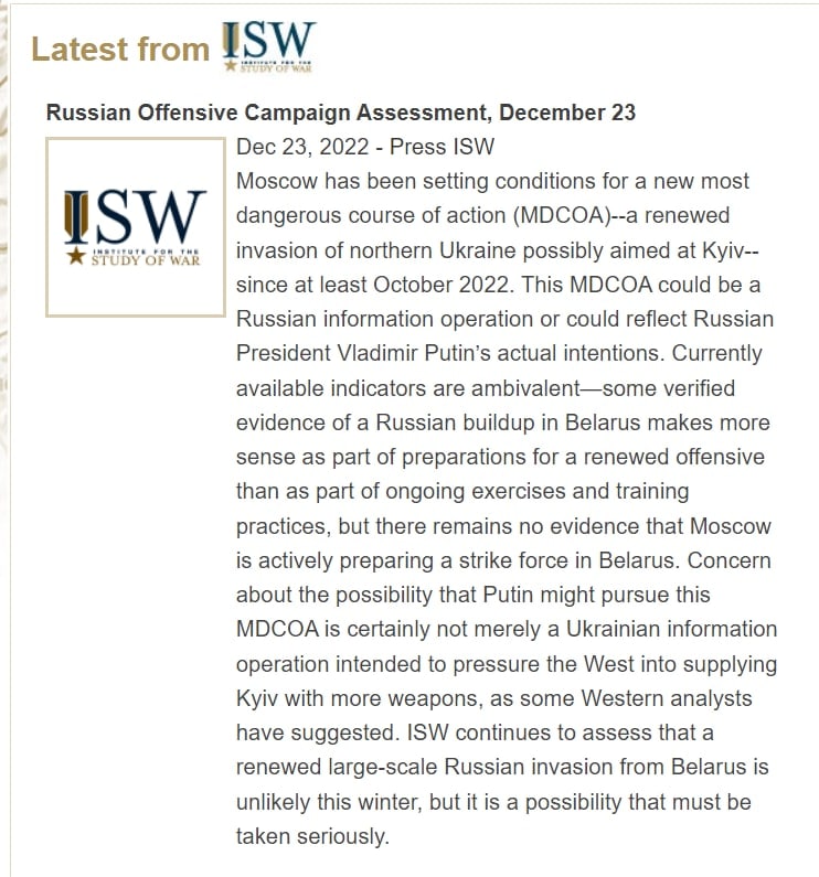 10:17 Возобновление крупномасштабного российского вторжения из Беларуси этой зимой маловероятно, но к этой возможности следует относиться серьезно, считает американский Институт изучения войны (ISW).