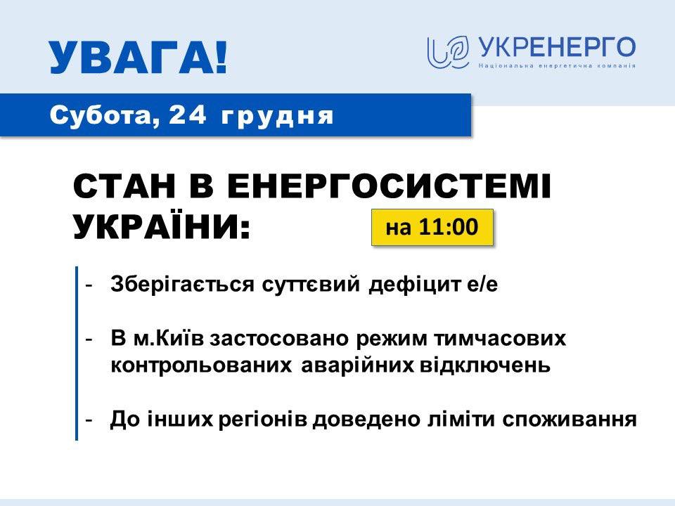11:32 На 24 декабря в энергосистеме страны сохраняется существенный дефицит электроэнергии, сообщает в своей официальной сводке "Укрэнерго".