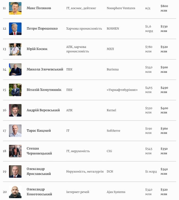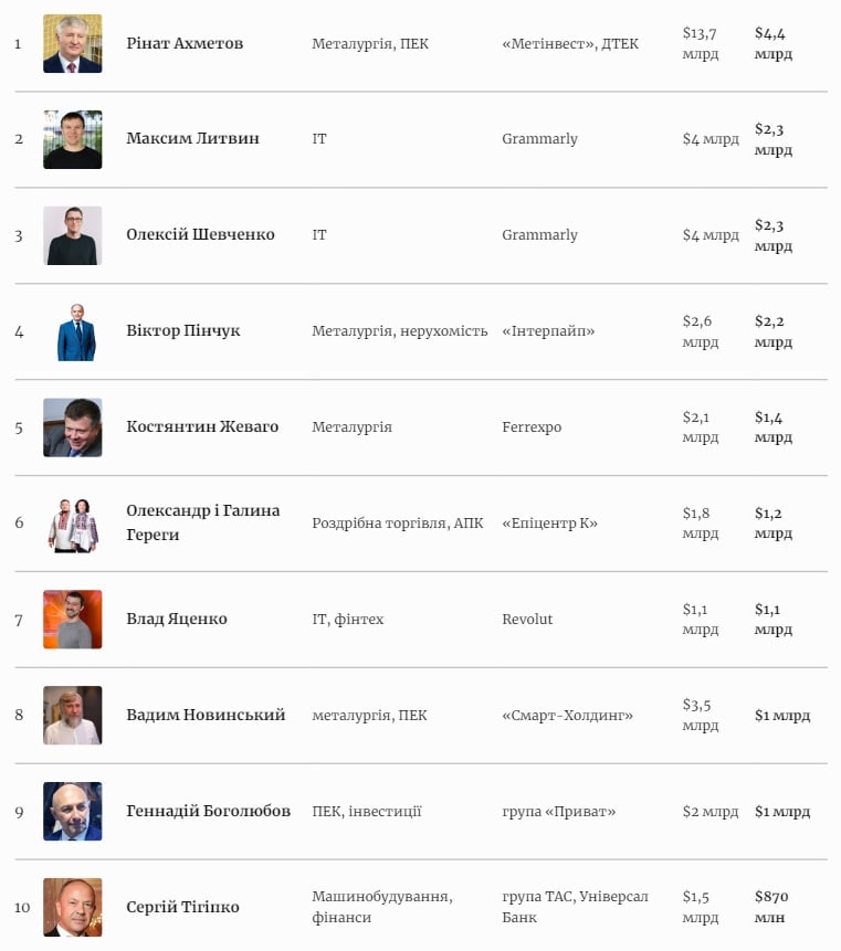 В первой десятке - три представителя сферы IT. В целом, первая десятка самых богатых украинцев выглядит так: