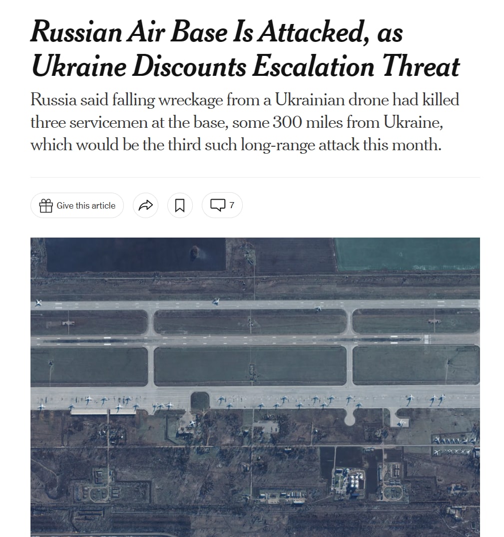 10:01 Новый удар по российскому аэродрому "Энгельс" отражает "мнение политического и военного руководства Украины о том, что риск эскалации войны со стороны Москвы в отместку невелик".