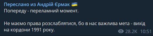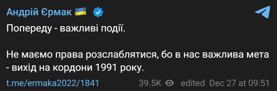"Впереди – важные события. Не имеем права расслабляться, потому что у нас важная цель – выход на границы 1991 года", - написал Ермак.