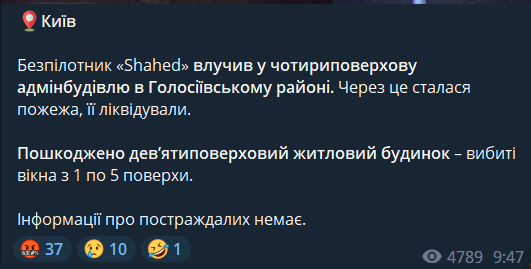 В пятницу, 30 декабря, в Киеве иранский дрон-камикадзе "Shahed" попал в четырехэтажное админздание в Голосеевском районе.