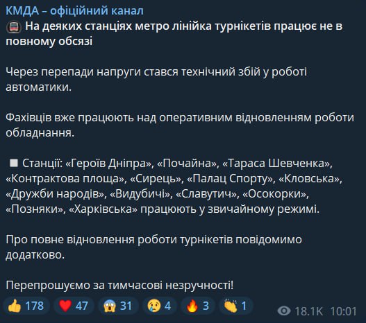 10.15 Проблемы с работой турникетов в метро Киева связаны со сбоем в работе автоматики из-за перепадов напряжения, сообщили в КГГА.