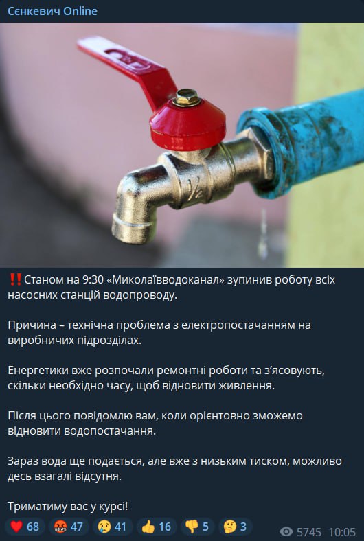 10.25 В Николаеве сегодня утром местный водоканал остановил работу всех насосных станций.