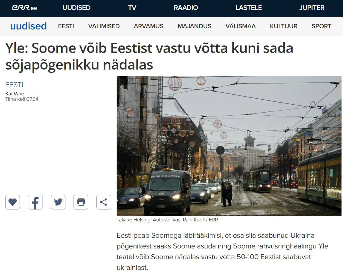 11.55 Эстония и Финляндия ведут переговоры о перенаправлении в Финляндию части украинских беженцев, прибывающих в Эстонию, пишет ERR.