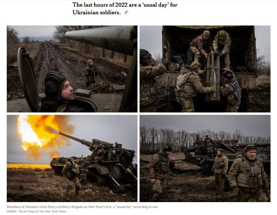 "Солдаты украинской 43-й тяжелой артиллерийской бригады провели канун Нового года возле лесной полосы, некоторые из них непрерывно курили, обстреливая российские укрепления в Кременной, ключевом городе Луганской области, который российские войска оккупировали с лета", - говорится в материале.