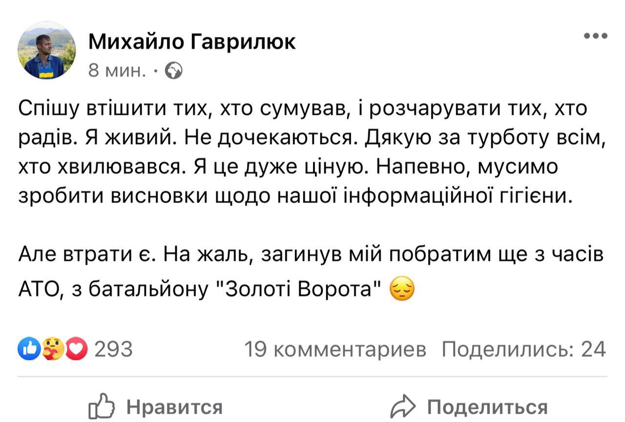 13.20 Экс-нардеп Гаврилюк лично подтвердил, что он жив.