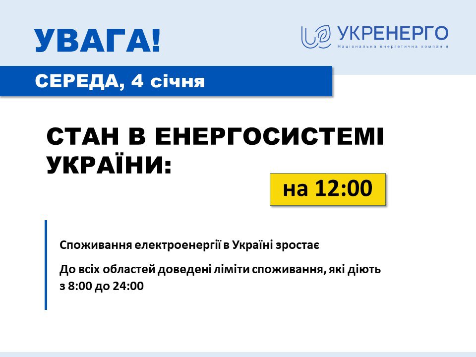 "Для обеспечения баланса в энергосистеме до всех областей Украины доведены лимиты потребления, действующие с 8:00 до 24:00. Напомним, превышение лимитов потребления приводит к применению аварийных ограничений", - говорится в сообщении.