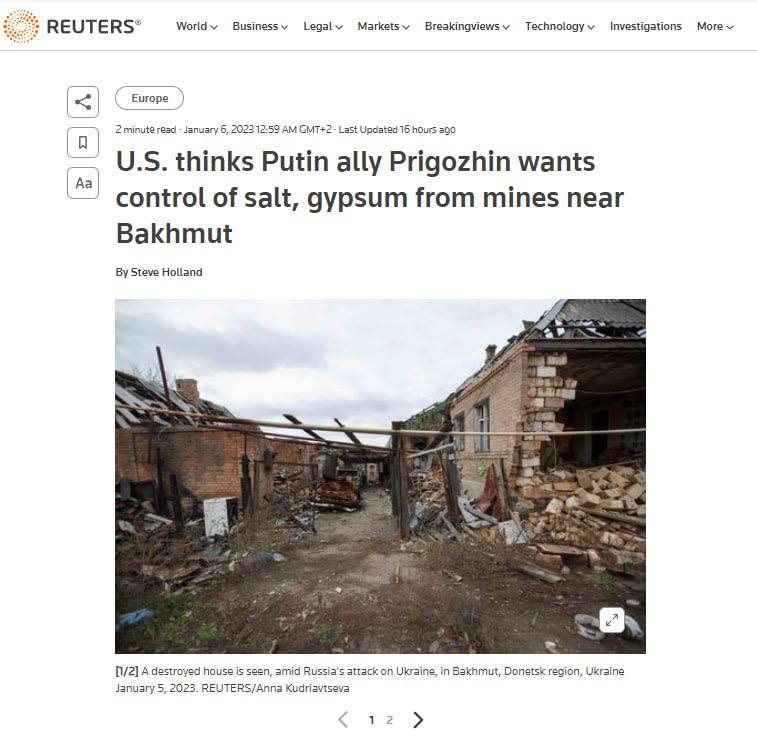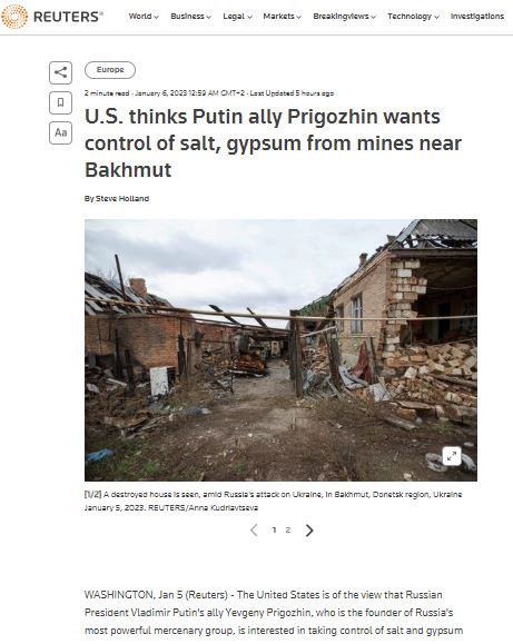 06.30 Глава ЧВК "Вагнер" Пригожин заинтересован в том, чтобы получить контроль над соляными и гипсовыми месторождениями около Бахмута.
