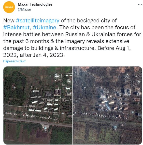 07.55 Компания Maxar Technologies опубликовала фото Бахмута со спутника, сравнив их с фото в августе 2022 года.