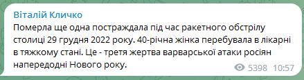 "Это - третья жертва варварской атаки россиян перед Новым годом", - сообщил Кличко.