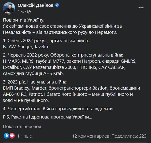 "Накопление Силами обороны бронетехники и других средств позволит подготовиться к нашей наступательной операции по освобождению законной территории. Рано или поздно мы получим и дальнобойные средства, и самолёты западного образца", - заявил советник Офиса президента в эфире у Марка Фейгина.
