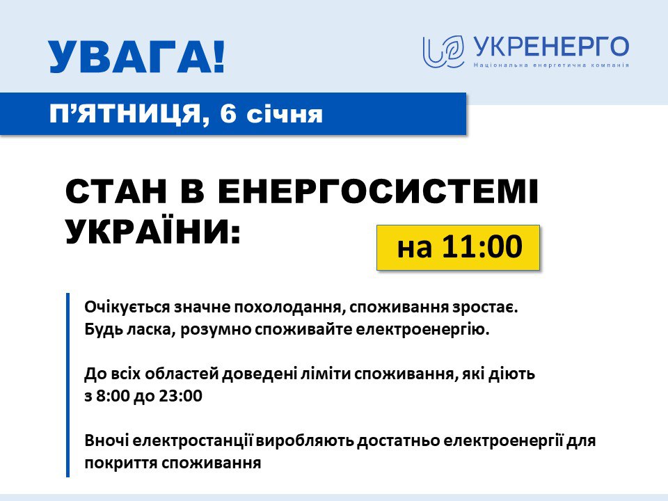 Для обеспечения баланса в энергосистеме до всех областей Украины доведены лимиты потребления, действующие с 08:00 до 23:00. Превышение лимитов приводит к применению аварийных отключений. В компании сообщили, что 5 января из-за превышения лимитов потребления в большинстве областей вводились аварийные отключения.