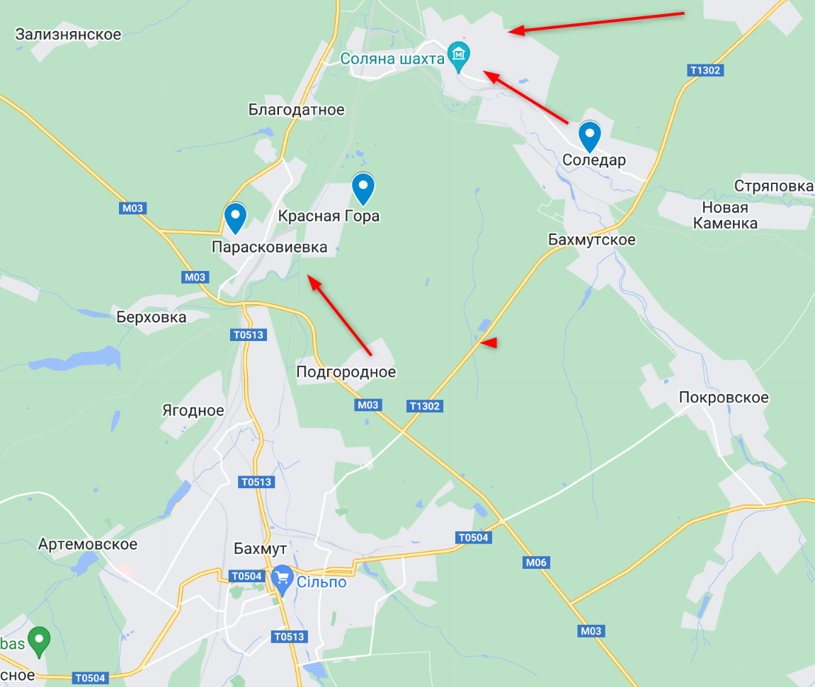 К северо-востоку от города, как пишут российские телеграм-каналы, противник вышел к окраинам Красной Горы и Парасковиевки. Украина этой информации не подтверждает. Но очевидно, что если бои в этом направлении действительно ведутся, то таким образом россияне пытаются перерезать коммуникации Бахмута и Соледара, чтобы либо окружить украинские войска в этом городе, либо вынудить их отступить в Бахмут, пока еще не перерезаны дороги.