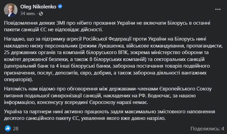 "Одна из причин, почему Беларусь не была подвергнута санкциям вместе с Россией в последних санкционных пакетах ЕС, является то, что Украина попросила не включать в них Минск", - написал он в Twitter.
