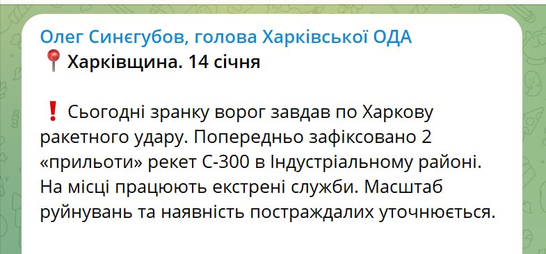 08:15 Губернатор Харьковской области уточнил, что в областном центре было не четыре, а два ракетных прилета С-300.