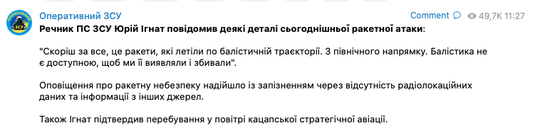 "Уведомление о ракетной опасности поступило с опозданием из-за отсутствия радиолокационных данных и информации из других источников. К сожалению, в Вооруженных Силах Украины нет эффективных средств обнаружения и уничтожения баллистических ракет", - заявил Игнат.