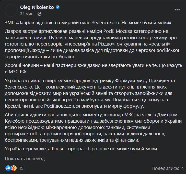 Об этом написал в своем тг-канале нардеп Ярослав Железняк, не уточнив, о чем конкретно идет речь.