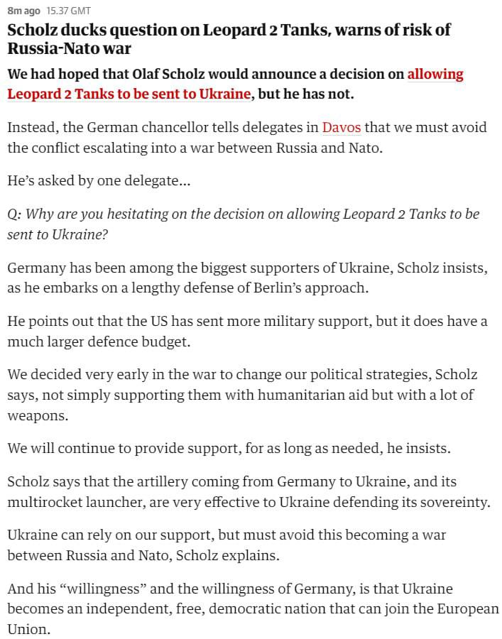 Не исключено, что, в первую очередь, эти заявления направлена на создание давления на Шольца, чтоб тот все-таки согласился на передачу танков, несмотря на свои нынешние колебания по этому вопросу.
