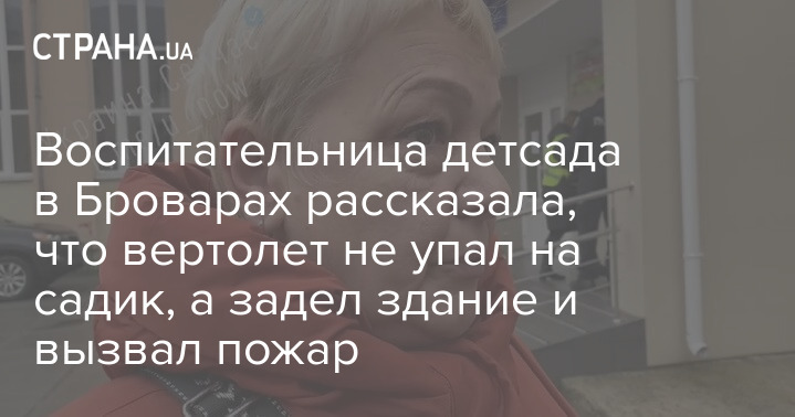 Воспитательница детского сада в Броварах Антонина Петровна рассказала, что вертолет не упал на детсад, а только задел здание садика, вызвав пожар.