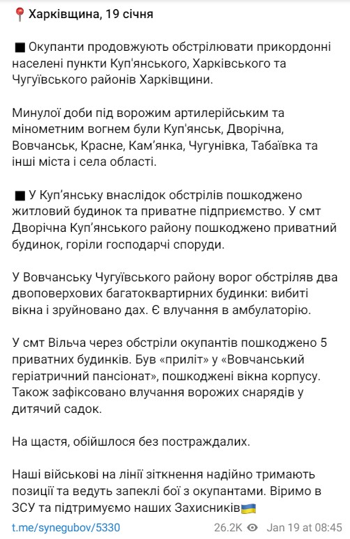 Об этом 19 января сообщил глава Харьковской ОВА Олег Синегубов в телеграм-канале.