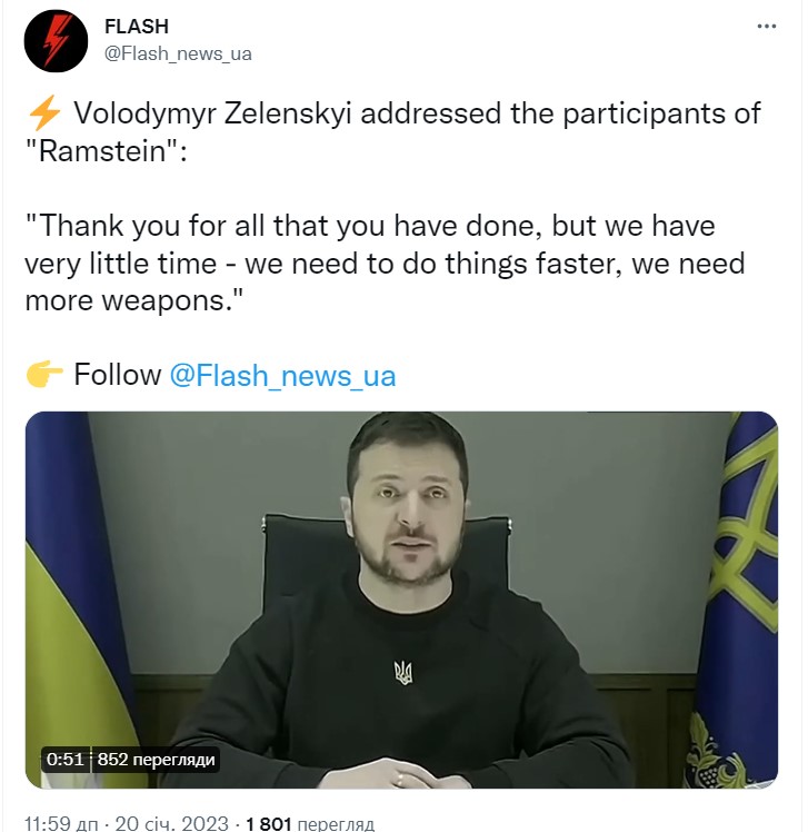 Также в обращении к "Рамштайну" Зеленский призвал страны НАТО ускориться в военной поддержке, так как время играет на РФ.