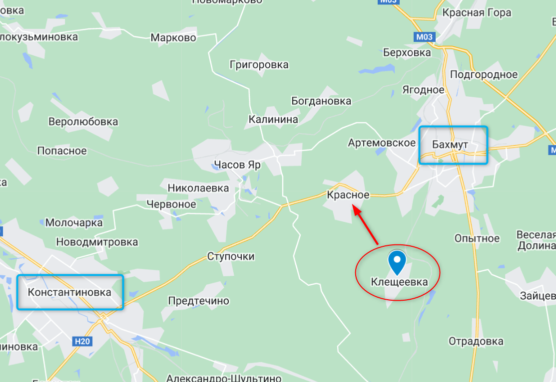 Ивановское (бывшее Красное) - село на трассе Константиновка - Бахмут, недалеко от Клещеевки, о захвате которой вчера заявляла ЧВК "Вагнер". Украина этой потери не подтверждала. Сама Клещеевка в сводке Генштаба упоминается как село, которое подвергалось обстрелам.