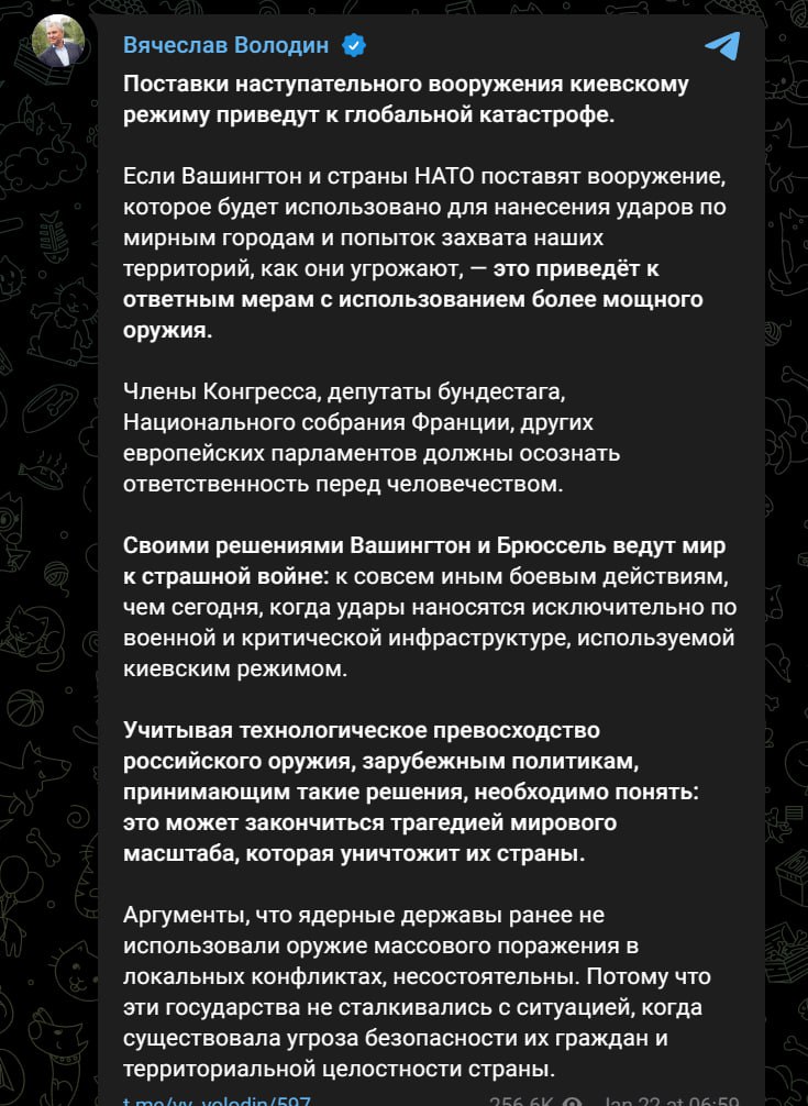 "Если Вашингтон и страны НАТО поставят вооружение, которое будет использовано для нанесения ударов по мирным городам и попыток захвата наших территорий, как они угрожают, — это приведёт к ответным мерам с использованием более мощного оружия", - написал Володин в Telegram.