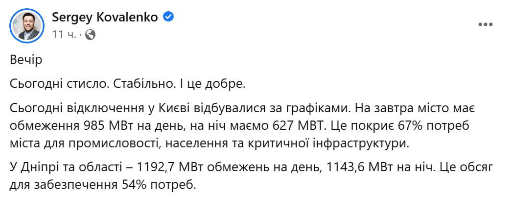 Гендиректор YASNO Сергей Коваленко заявил вчера, что Киеву сегодня позволят покрыть 67% потребностей, а Днепру - 54%.