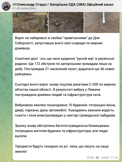Ночью и утром россияне нанесли ракетный удар из С-300 по двум селам в Запорожье.