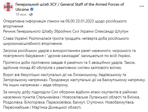 06.50 Генштаб ВСУ обнародовал сводку о ситуации на фронте 23 января.