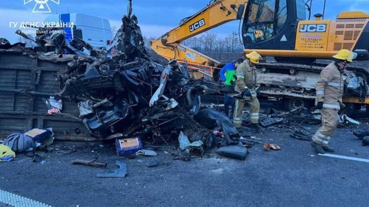 По данным местных изданий, ДТП произошло вблизи города Лубны. Столкнулись микроавтобус Mercedes-Benz и стоящий в попутном направлении грузовик MAN.