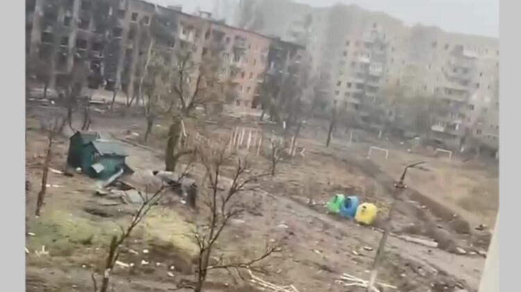 На видео можно заметить, что практически все многоэтажки повреждены обстрелами.