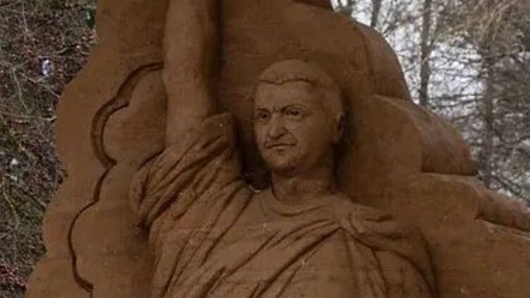 По ее словам, скульптура установлена в городе Тырва. Песчаный Зеленский поднимает одну руку вверх, а во второй держит щит с трезубцем. При этом он одет в римскую тогу.