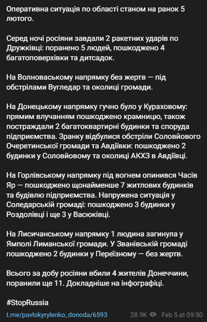 На Лисичанском направлении один человек погиб в Ямполе Лиманской громады. Всего за сутки погибли четверо жителей Донбасса, ранены еще 11.
