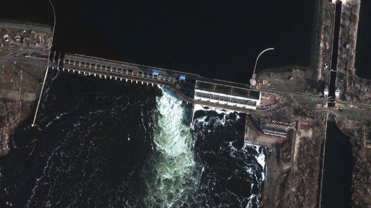 Вода идет бурным потоком через шлюзовые затворы гидроэлектростанции, контролируемой российскими войсками. В результате спутниковые снимки показывают, что уровень воды в водохранилище упал до самой низкой отметки за 30 лет.