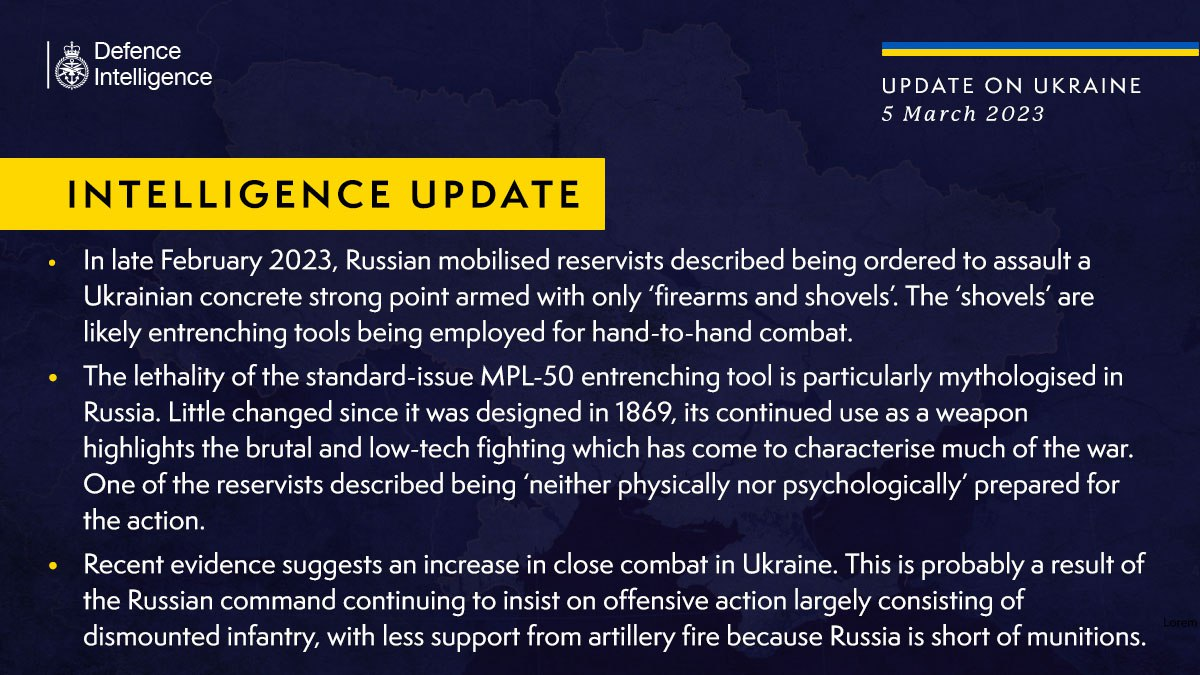 "Летальность штатного шанцевого орудия МПЛ-50 особенно мифологизирована в России.... его постоянное использование в качестве оружия подчеркивает жестокие и низкотехнологичные боевые действия, которые стали характеризовать большую часть войны", - заявляет британская разведка.