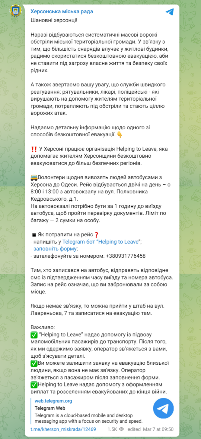 Горсовет предоставляет подробную информацию об одном из способов бесплатной эвакуации. В Херсоне работает организация Helping to Leave, которая помогает жителям региона бесплатно эвакуироваться в более безопасные регионы.