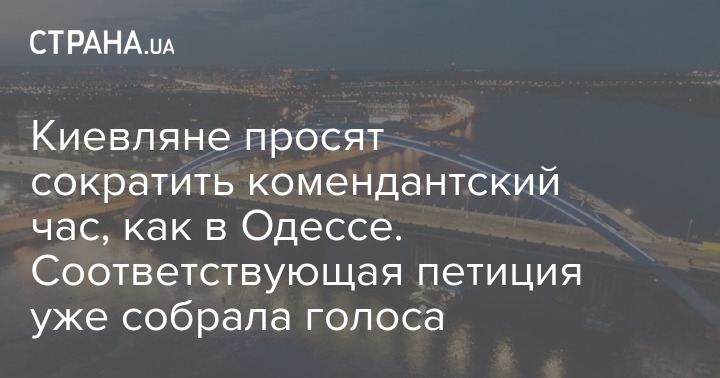 Соответствующая петиция с предложением изменить продолжительность комендантского часа в столице, размещенная на сайте Киевского горсовета, уже набрала необходимые шесть тысяч подписей и теперь должна быть рассмотрена властями Киева.