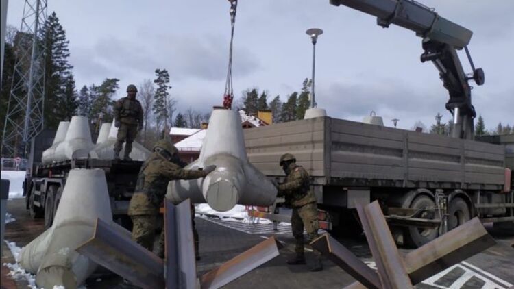 Польские военные ставят противотанковые ежи на дорогах, ведущих в Беларусь.