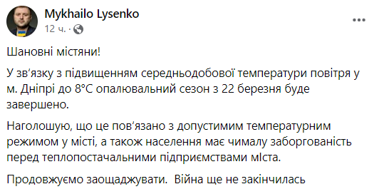 "В связи с повышением среднесуточной температуры воздуха в Днепре до 8°C отопительный сезон с 22 марта будет завершен", - написал он