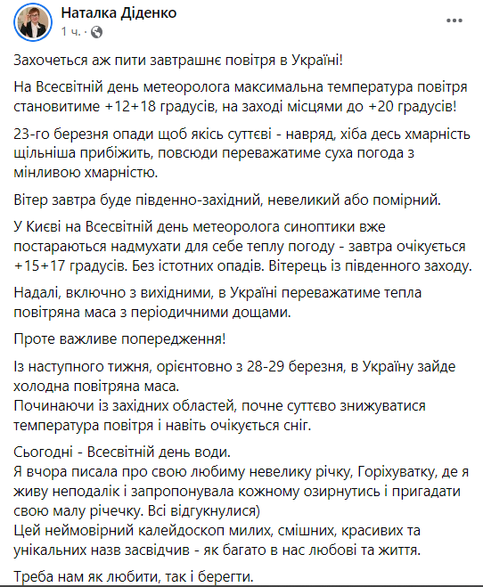 Она также предупредила, что с 28-29 марта в Украину зайдет холодная воздушная масса. Начиная с западных областей начнет существенно снижаться температура воздуха и даже ожидается снег.