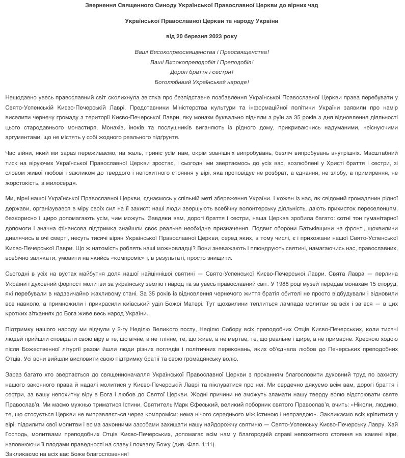 "Сейчас многие обращаются к священноначалию Украинской Православной Церкви с просьбой благословить духовный труд по защите нашего законного права и в дальнейшем молиться в Киево-Печерской лавре и заботиться о ней. Мы сердечно благодарим всех вас, дорогие братья и сестры, за вашу непоколебимую веру в Бога и любовь к Святой Церкви. Никакие причины не смогут сломить нашу жесткую волю отстаивать святое Православие", - заявляет Синод УПЦ.