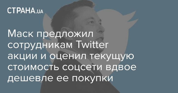 Американский бизнесмен Илон Маск предложил сотрудникам Twitter вознаграждение в виде акций, исходя из оценки компании в 20 млрд долларов, тем самым фактически признав двукратное падение стоимости соцсети после ее покупки.