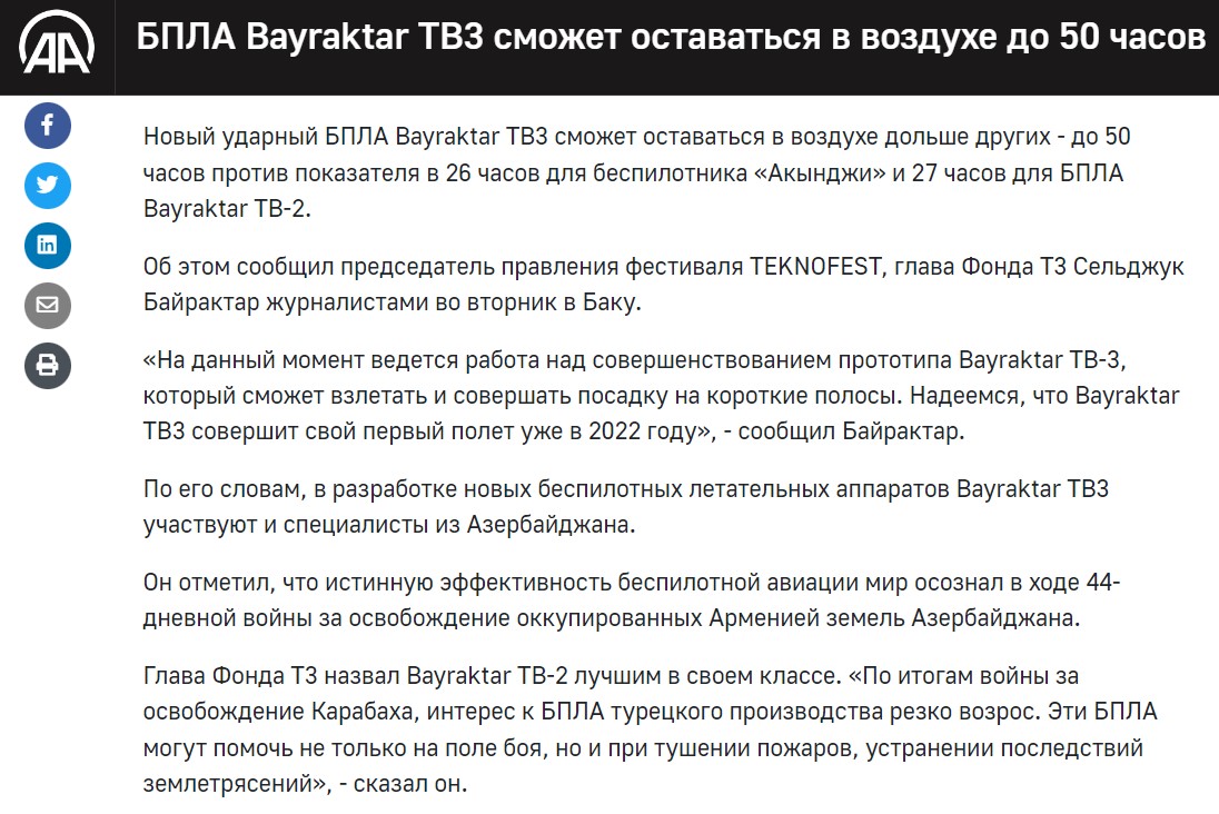 Новый беспилотник Bayraktar TB-3 сможет оставаться в воздухе фактически вдвое дольше своих предшественников - до 50 часов против 26-ти. В его разработке принимали участие и специалисты из Азербайджана. Эти БПЛА могут помочь не только на поле боя, но и при тушении пожаров, устранении последствий землетрясений, говорил Сельджук Байрактар.